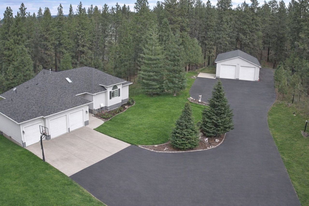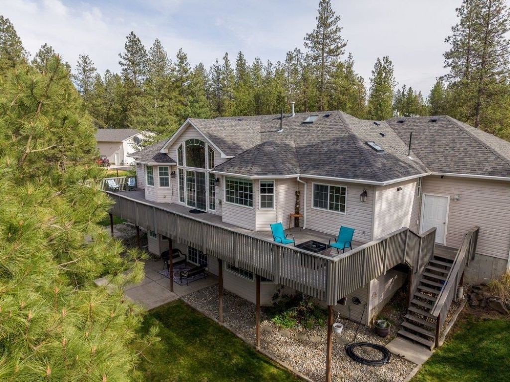 Enjoy tranquility on 5 acres with a modern home and finished shop. Minutes to downtown Spokane, airport, medical and freeway. Daylight rancher features vaulted ceilings, custom windows and great room that flows onto 600 sf of treks deck overlooking a clean, walkable and firewise forest. Kitchen has granite countertops, pull out drawers, pantry, skylights and is right off laundry, mudroom and wc. Oversized 3 car garage walks out to deck and backyard. Primary ensuite features slider to deck, spa like bath with walk in shower, double sinks and, 6soaking tub with privacy and views and very large closet.. 2nd main floor bedroom is oversized and has walk-in closet. Daylight basement features new vinyl plank flooor, slider to covered patio and backyard, 2 bedrooms and a full bath. Upscale finished and heated shop ready for toys and hobbies and more. MUST SEE!